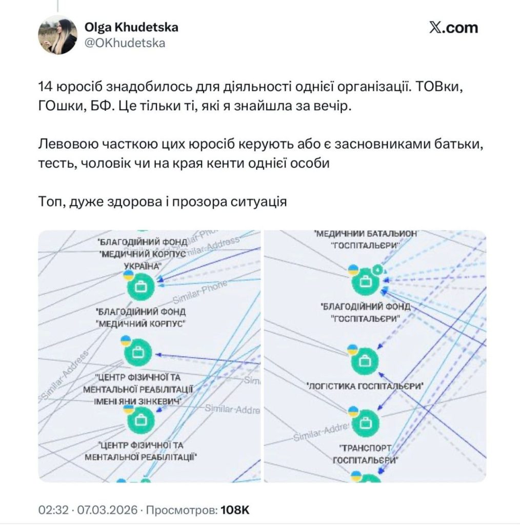Зазначається, що організація нібито не має єдиного офіційно оформленого фонду. Повідомляється про наявність кількох юридичних осіб — ТОВ, громадських організацій та благодійних фондів, пов’язаних між собою.